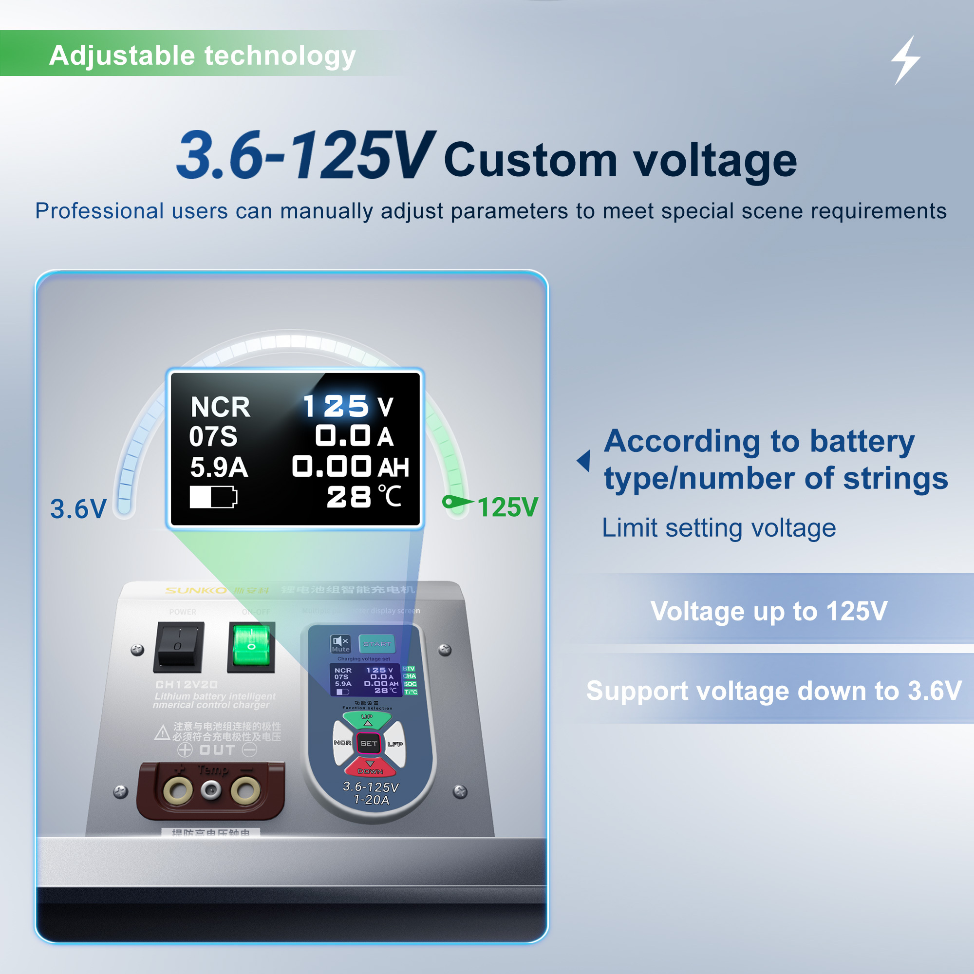 Charging voltage:3.6V~60V/125V (Intelligent adjustment)