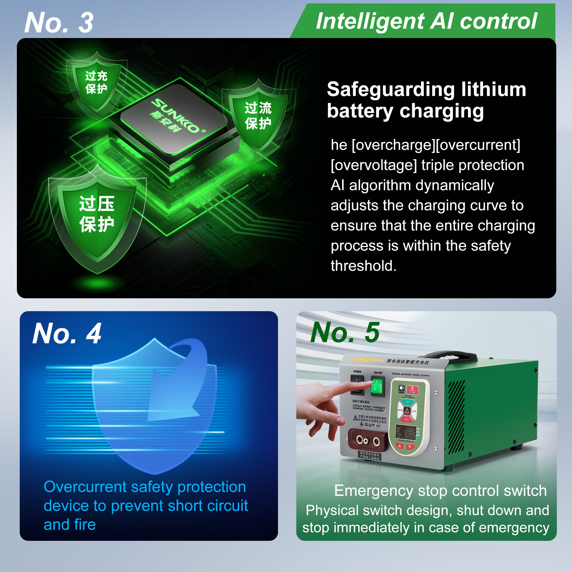 CH12V20 lithium battery pack intelligent CNC charger is a safe charging solution designed for Li-ion /LifePO4 battery modules. lt is a professional lithium battery charging device that integrates intelligent matching, safety protection and efficient charging.Through intelligent voltage digital control adjustment technology and multiple safety protection systems, the potential safety hazards of overcharging and short circuit caused by incorrect parameter settings in traditional chargers are completely resolved, providing dual protection for battery life and user safety. Protecting safety with technological innovation, so that every battery can be charged and used with peace of mind.